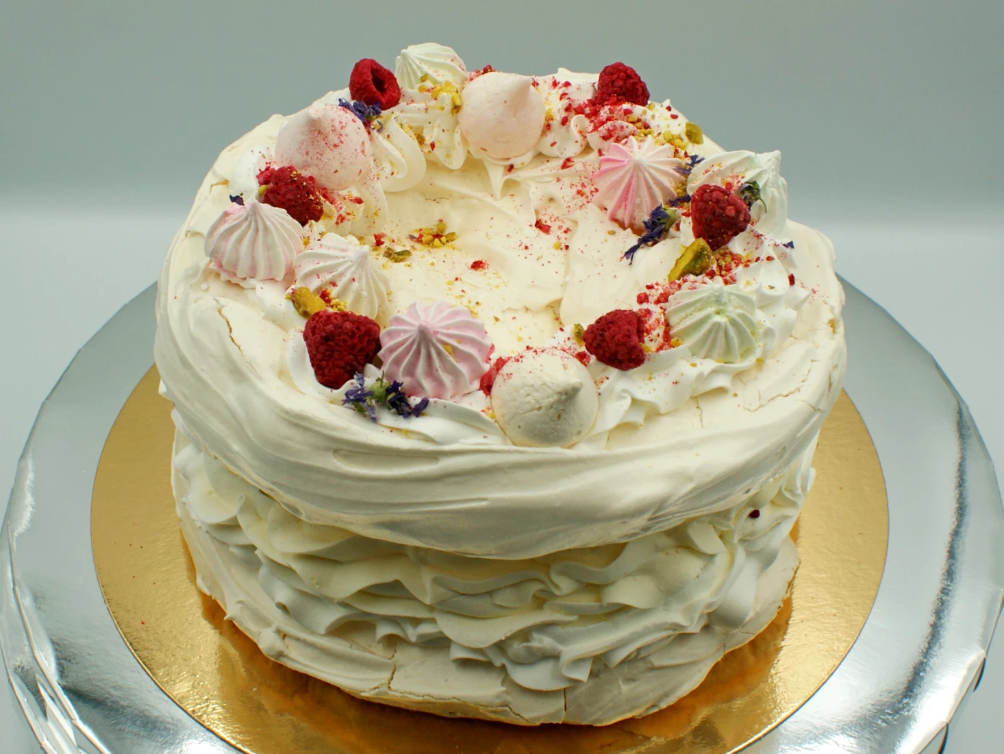 Beza, krem: śmietanka, mascarpone i maliny w środku.