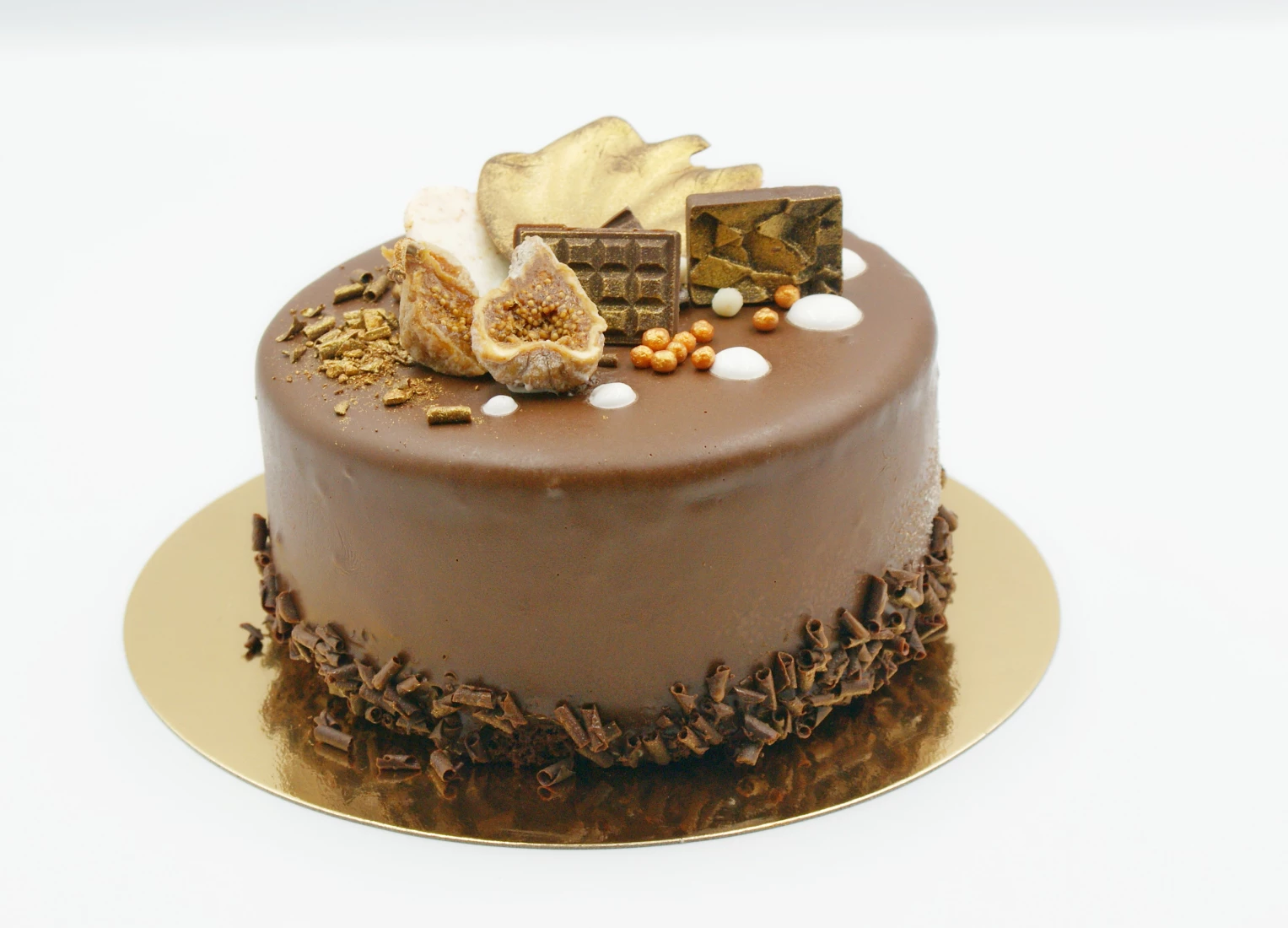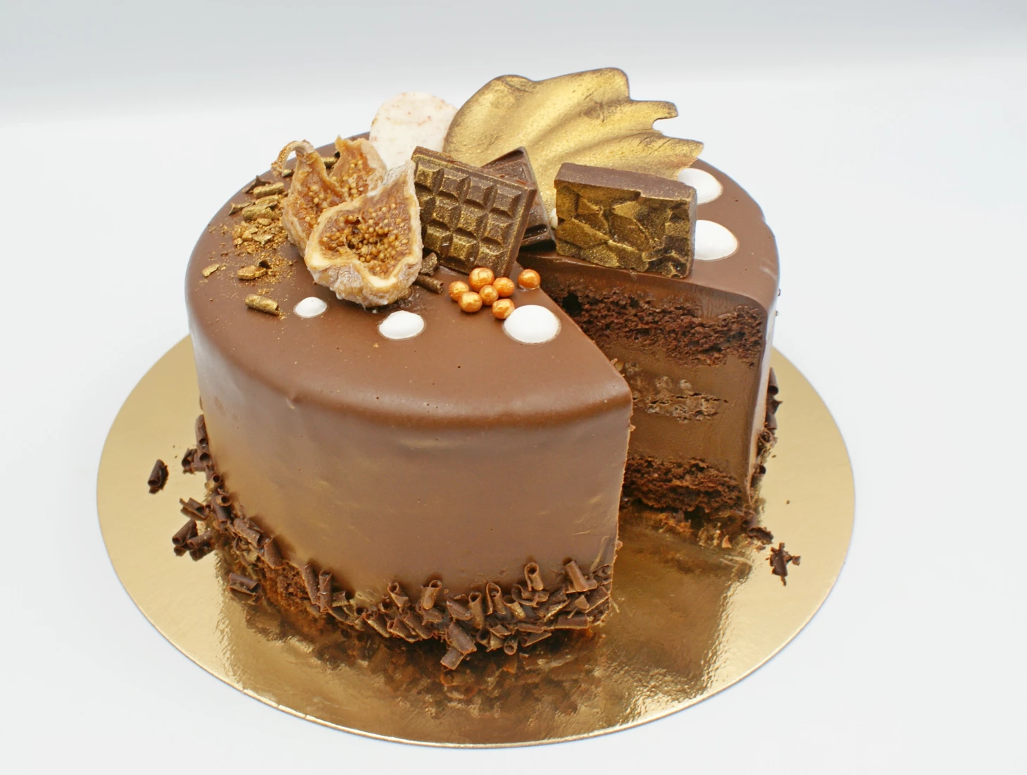 Biszkopt czekoladowy, chrupiący krem orzechowy i ganasz czekoladowy.