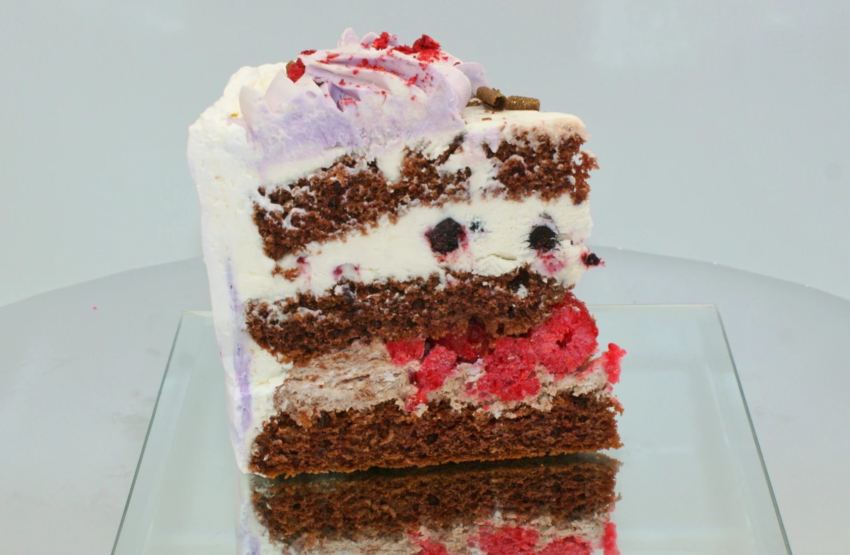 3 warstwy biszkoptu czekoladowego, krem z bitej śmietany i mascarpone z jagodami, drugie przełożenie to krem czekoladowy ze śmietaną z mascarpone i malinami. Tort lekki w smaku, nasączony ponczem.