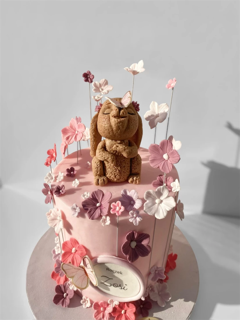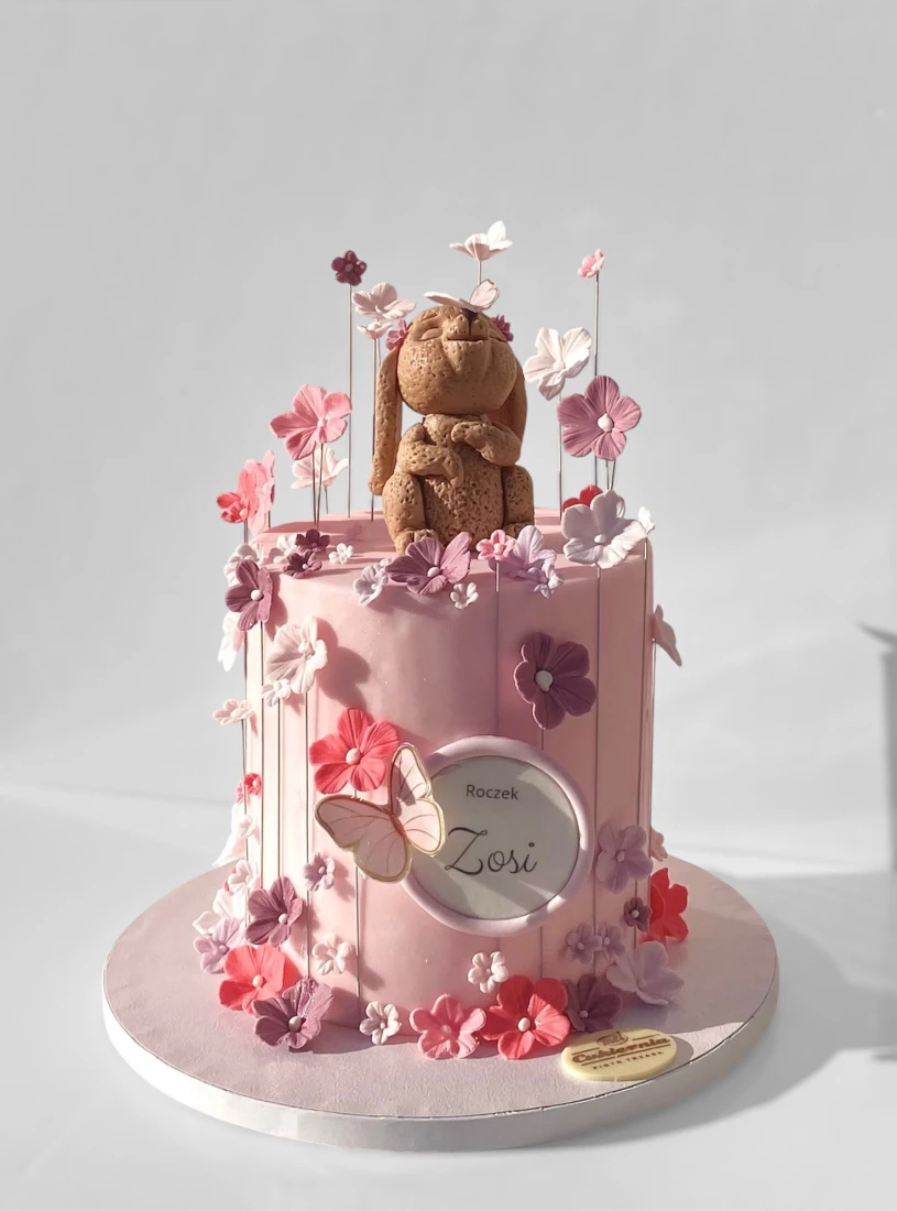 Dekoracja tortu jest w całości wykonana z masy cukrowej.